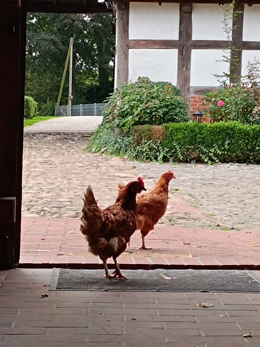 Die Hühner bei uns auf dem Hof geben sich Mühe jeden Morgen ein frische Ei zu legen, diese können dann immer frisch aus dem Stall geholt werden! Es kommt auch schon mal vor, dass man ein Ei in den Büschen findet!